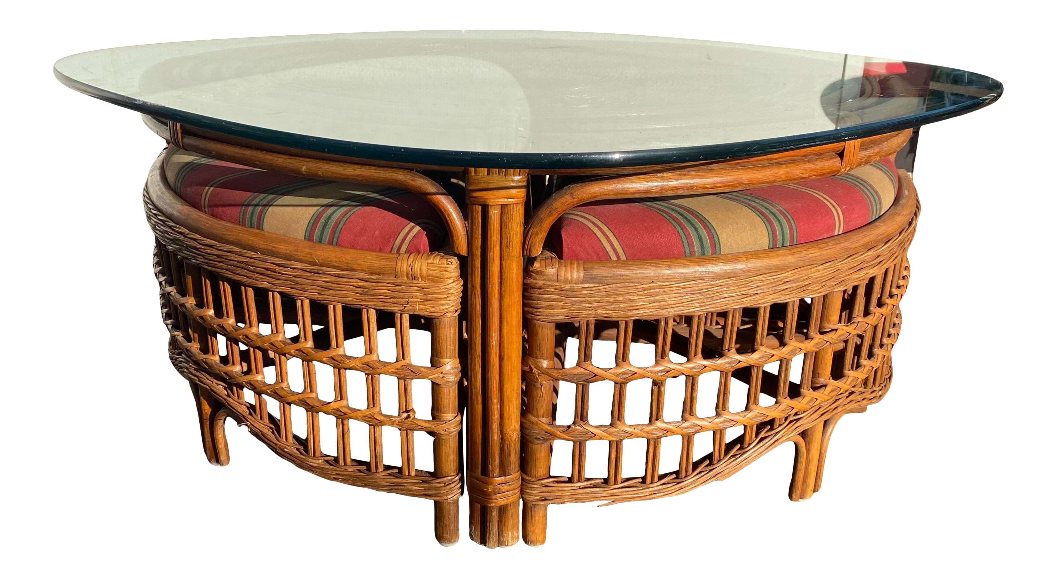 Vintage Boho Chic Round Rattan Coffee Table With 4 Nesting Stools 5 Pieces Chairish